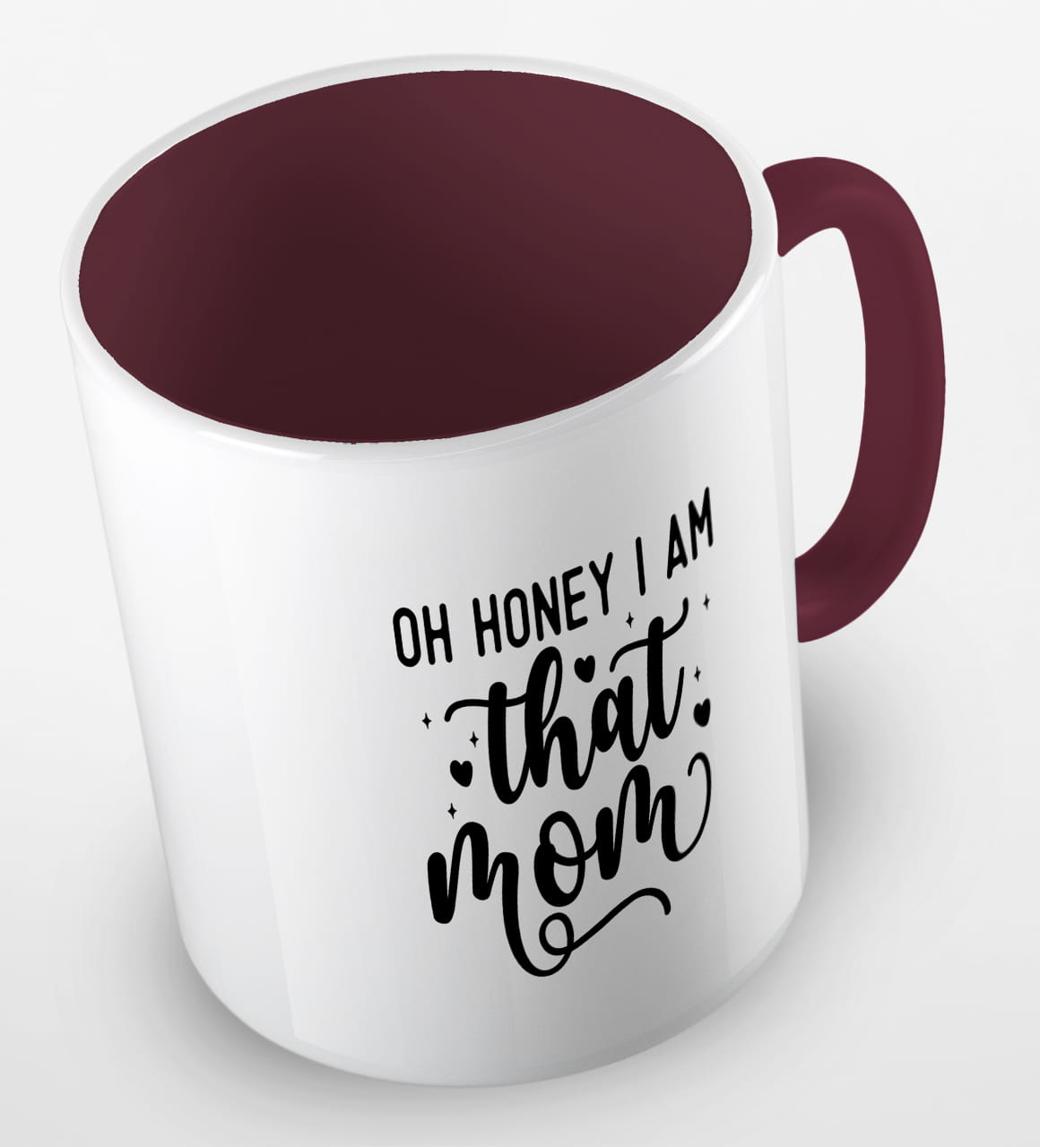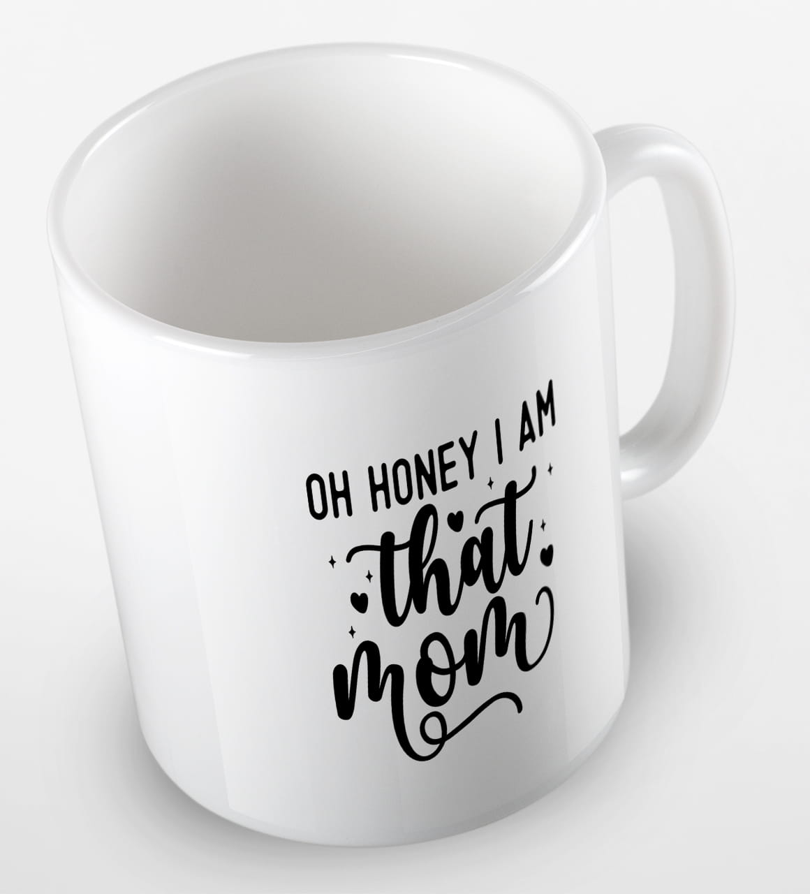 Kubeczek dla mamy z napisem "Oh honey, I am that mom". Zabawny prezent na Dzień Mamy, a także z okazji urodzin czy imienin.