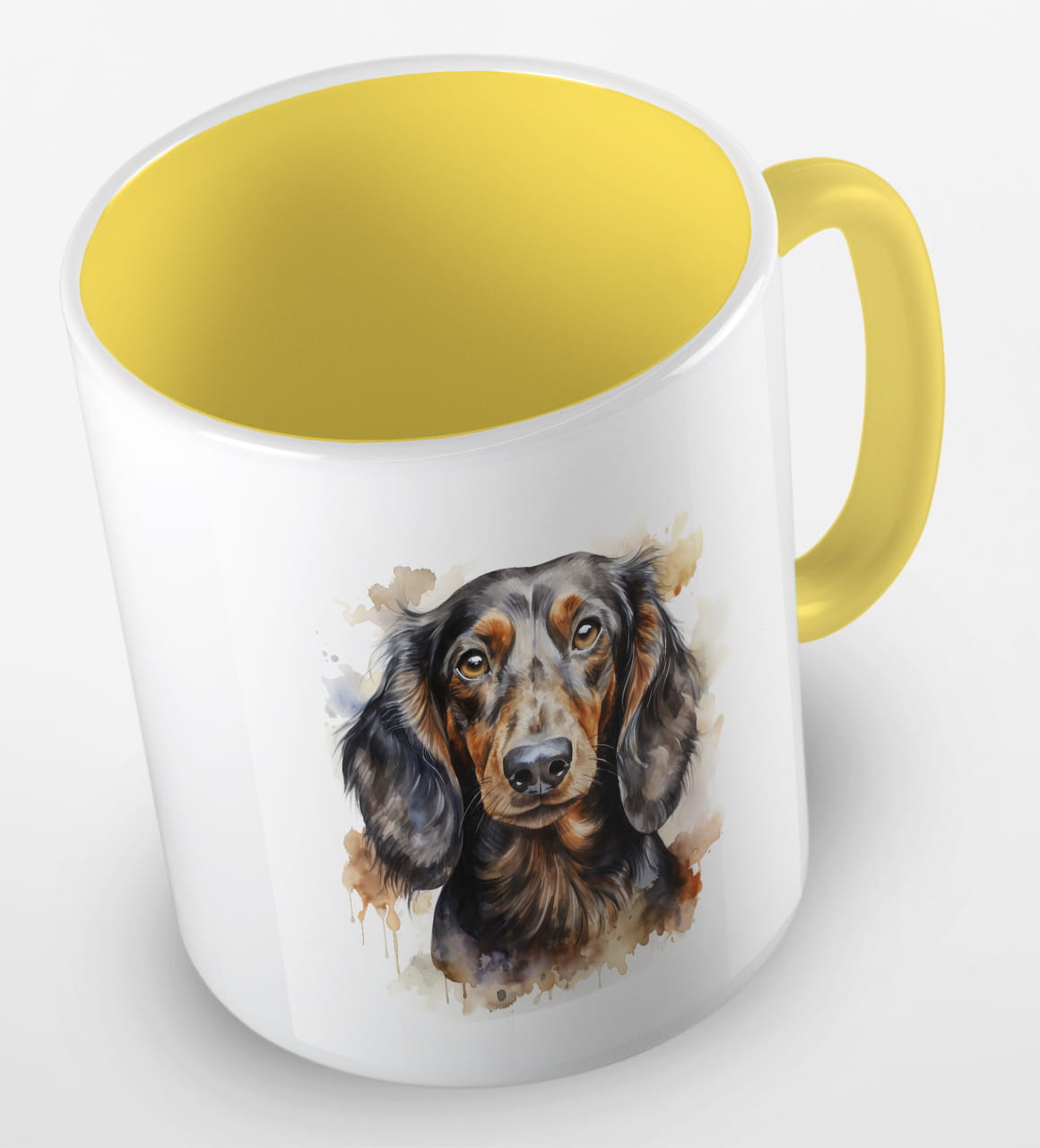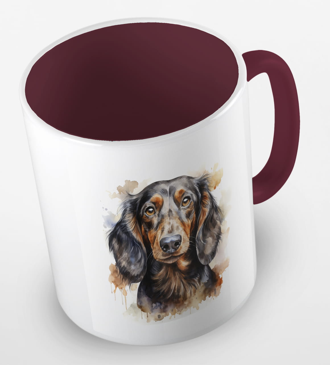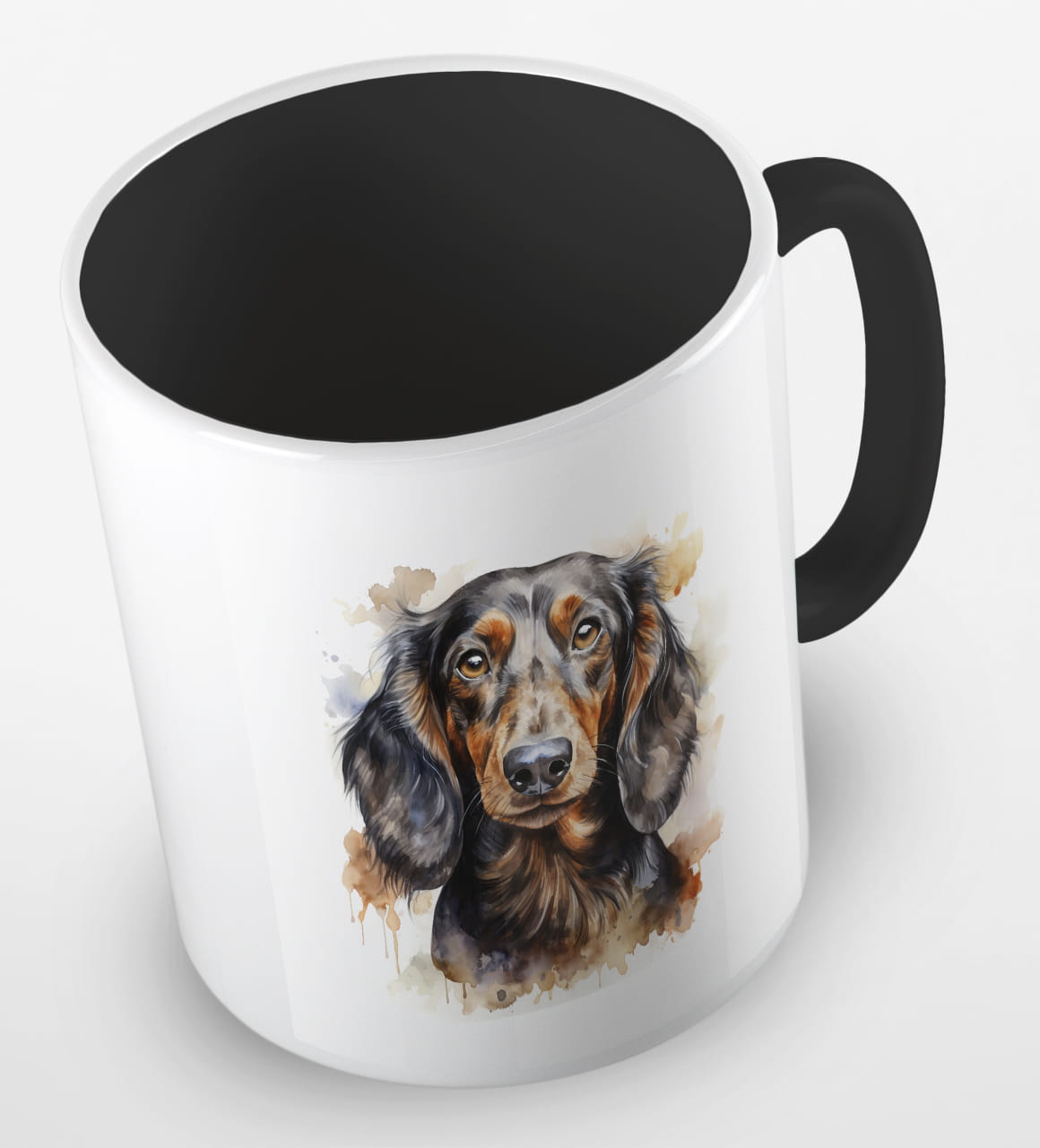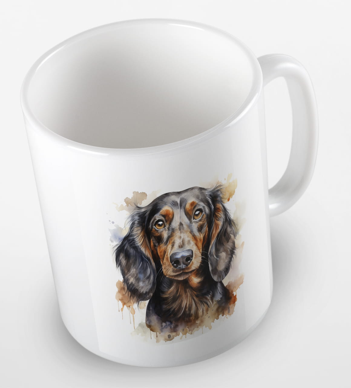 Kubeczek z pieskiem - czarnowłosym jamnikiem - portretem wykonanym akwarelą.