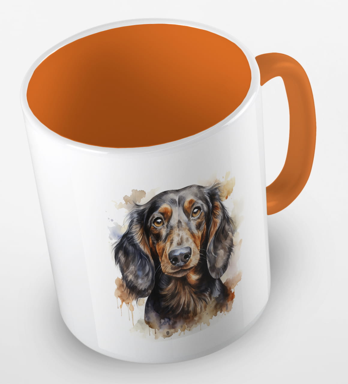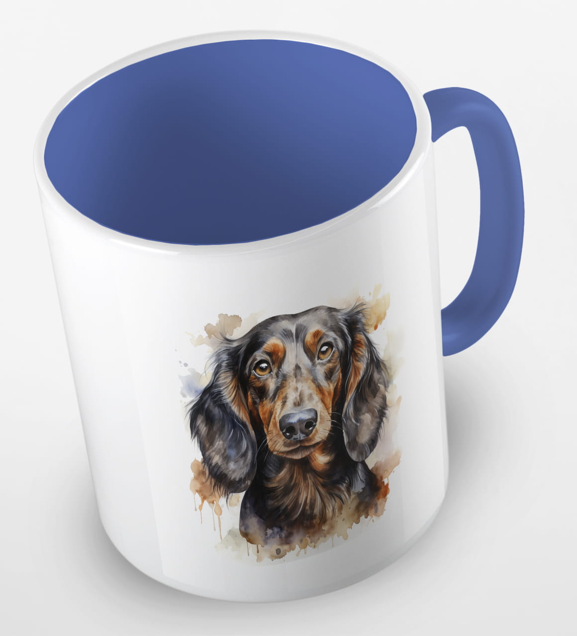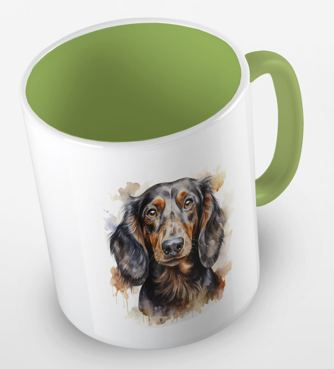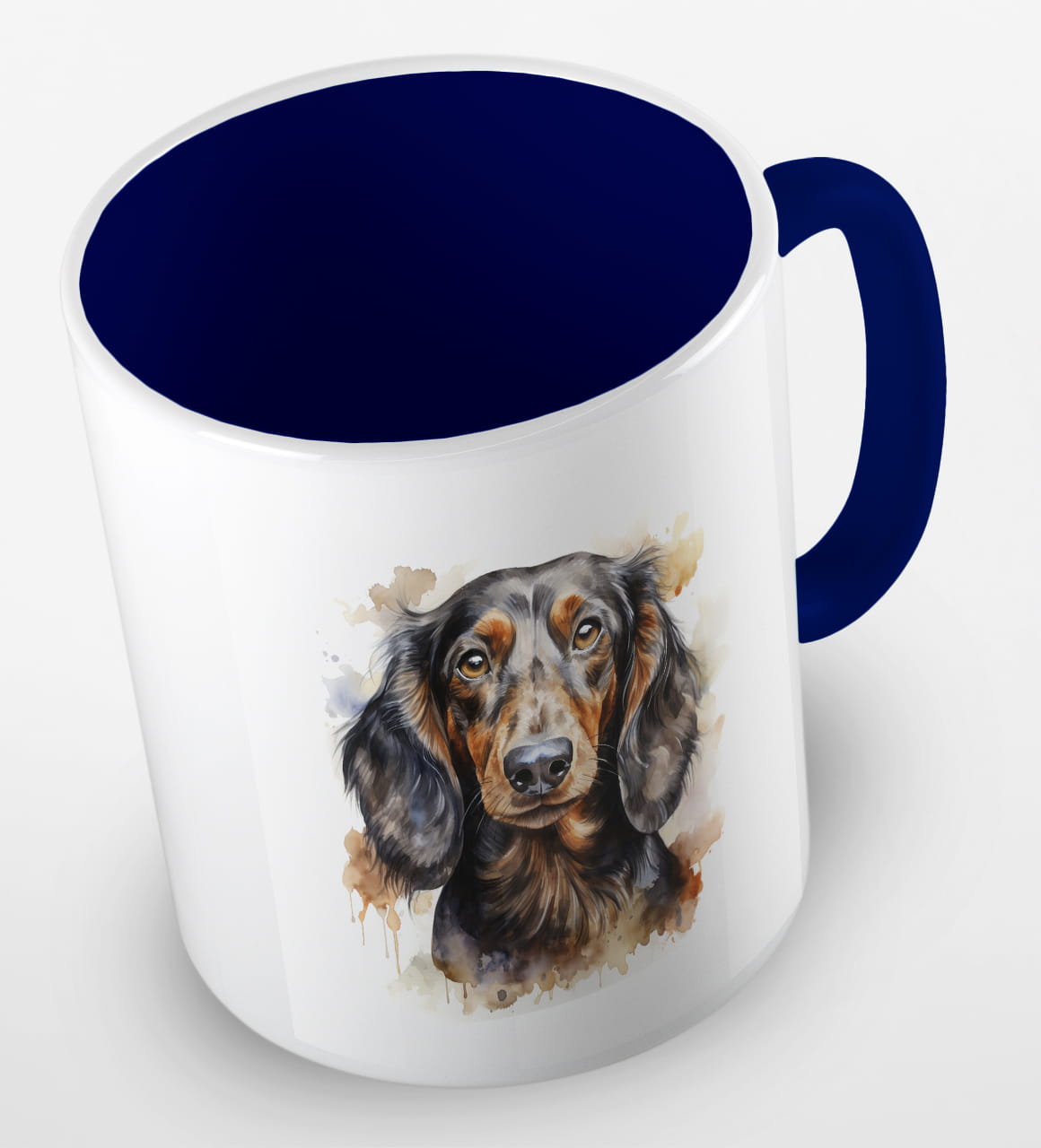 Kubeczek z pieskiem - czarnowłosym jamnikiem - portretem wykonanym akwarelą.