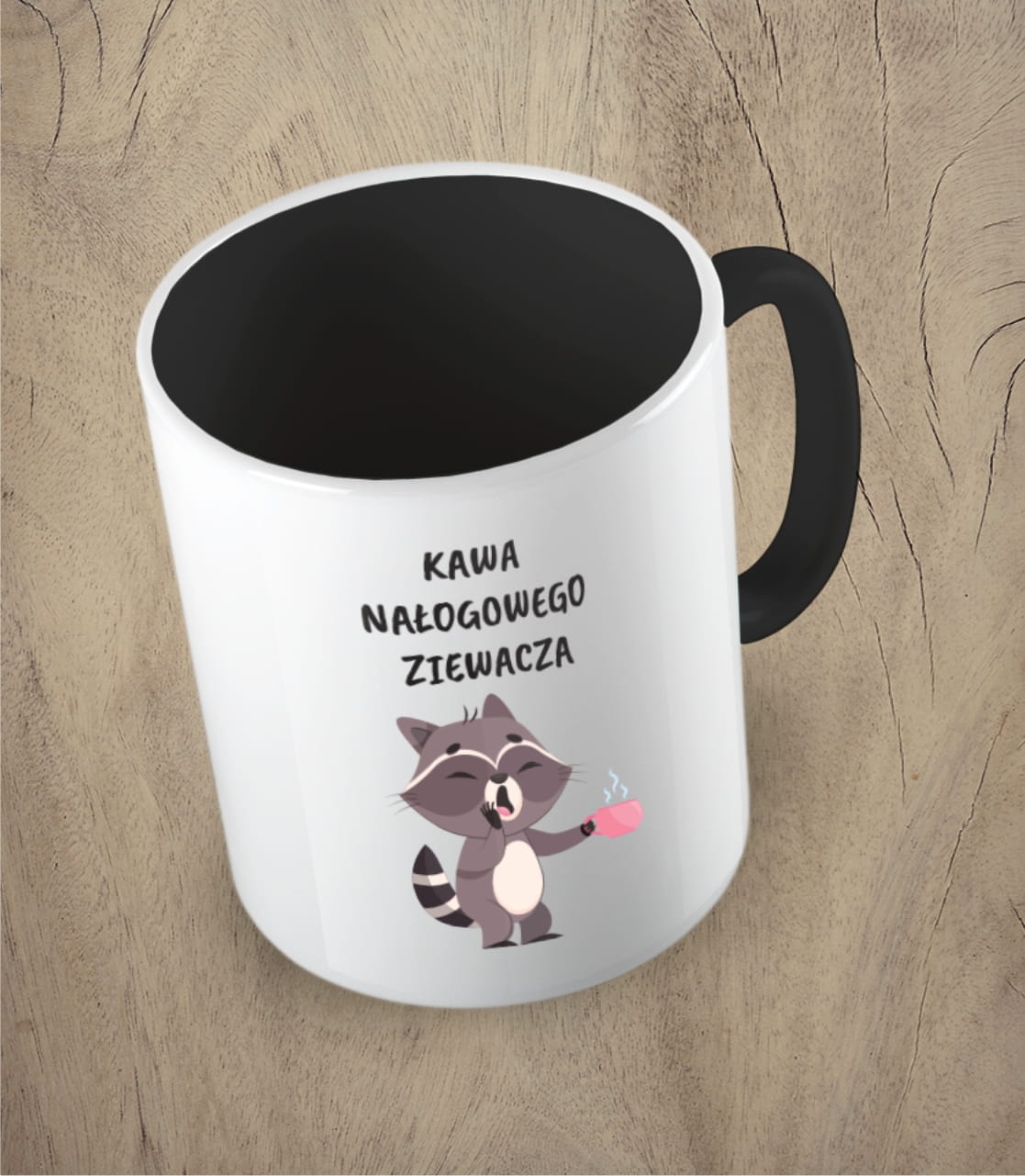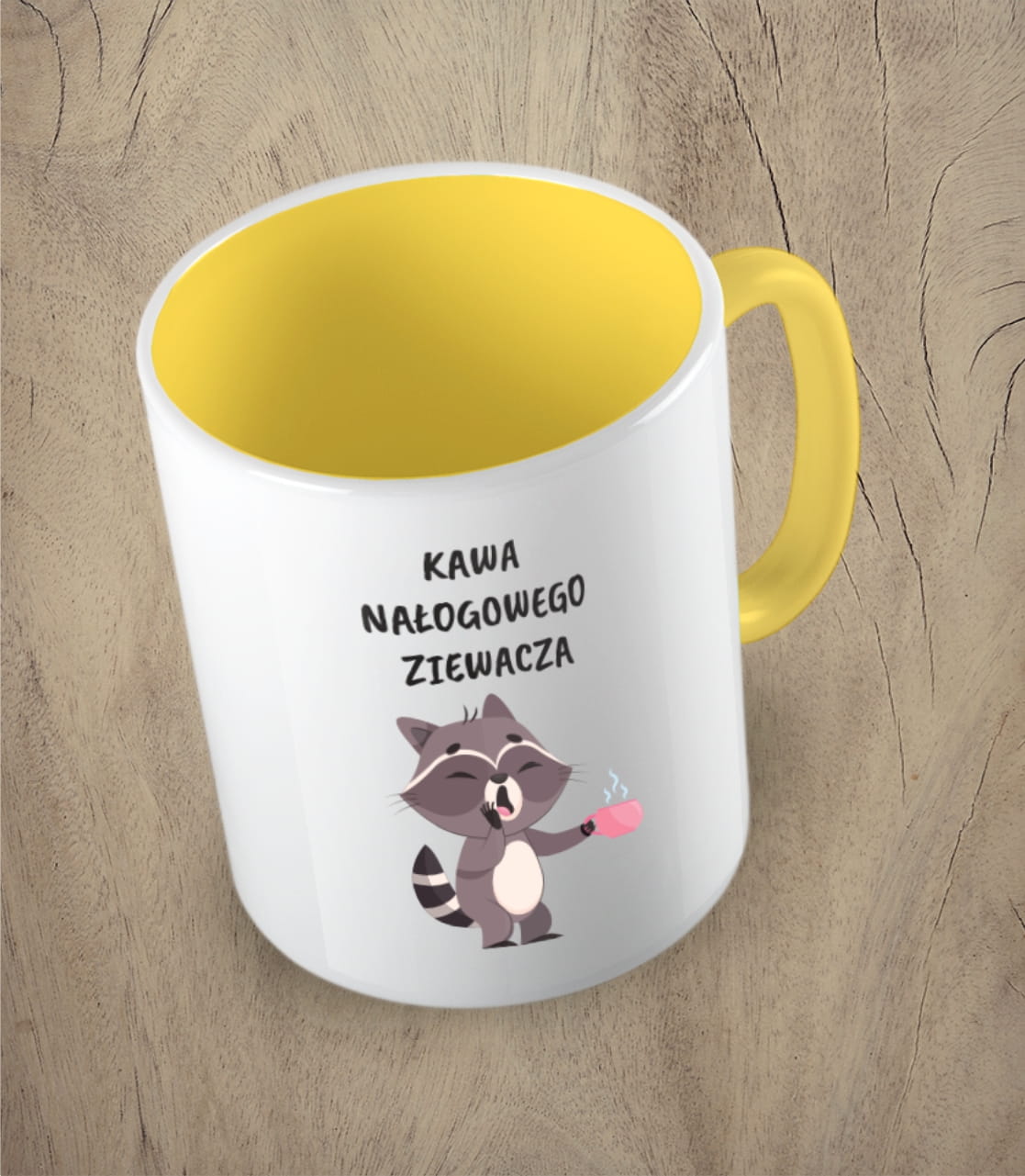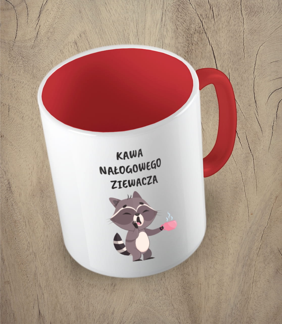 Zabawny kubek na prezent z rysunkiem ziewającego szopa z kubkiem kawy.