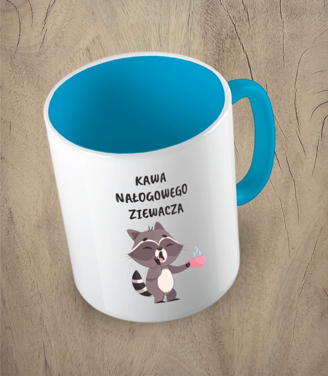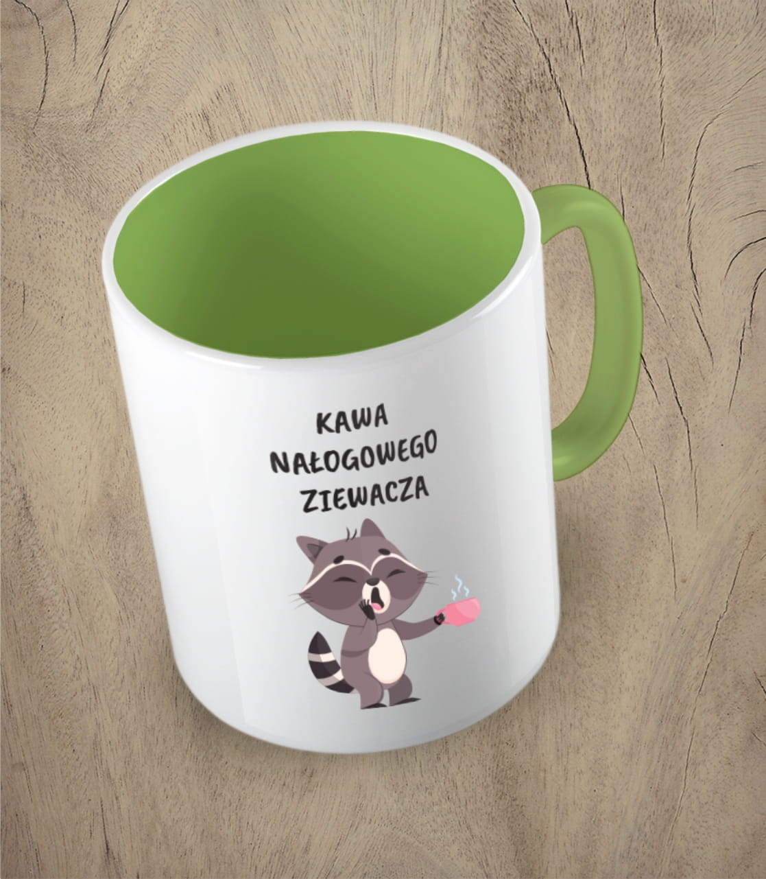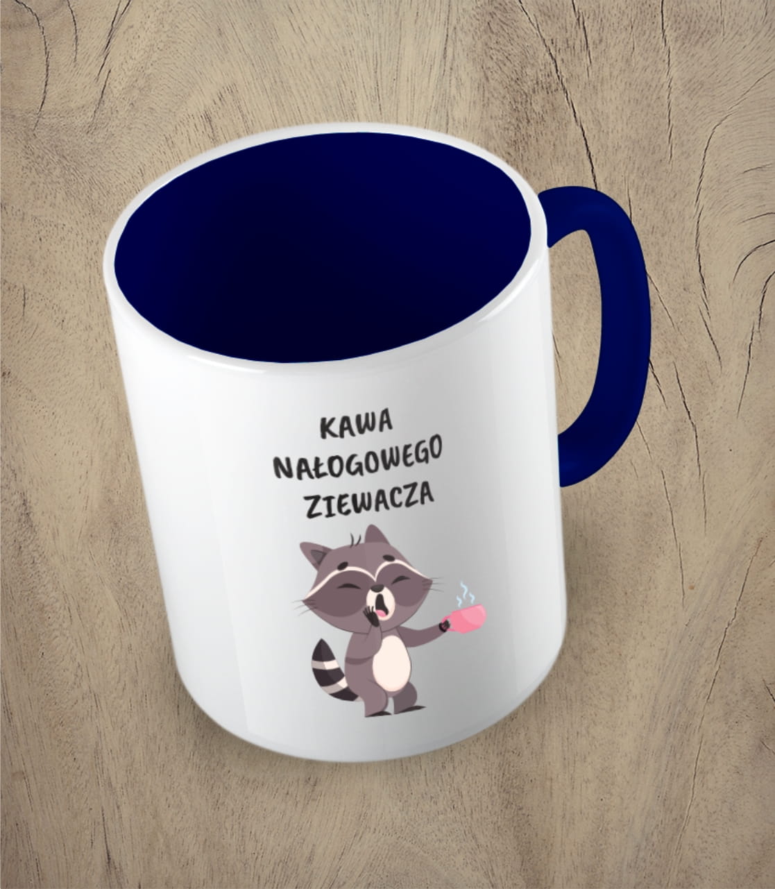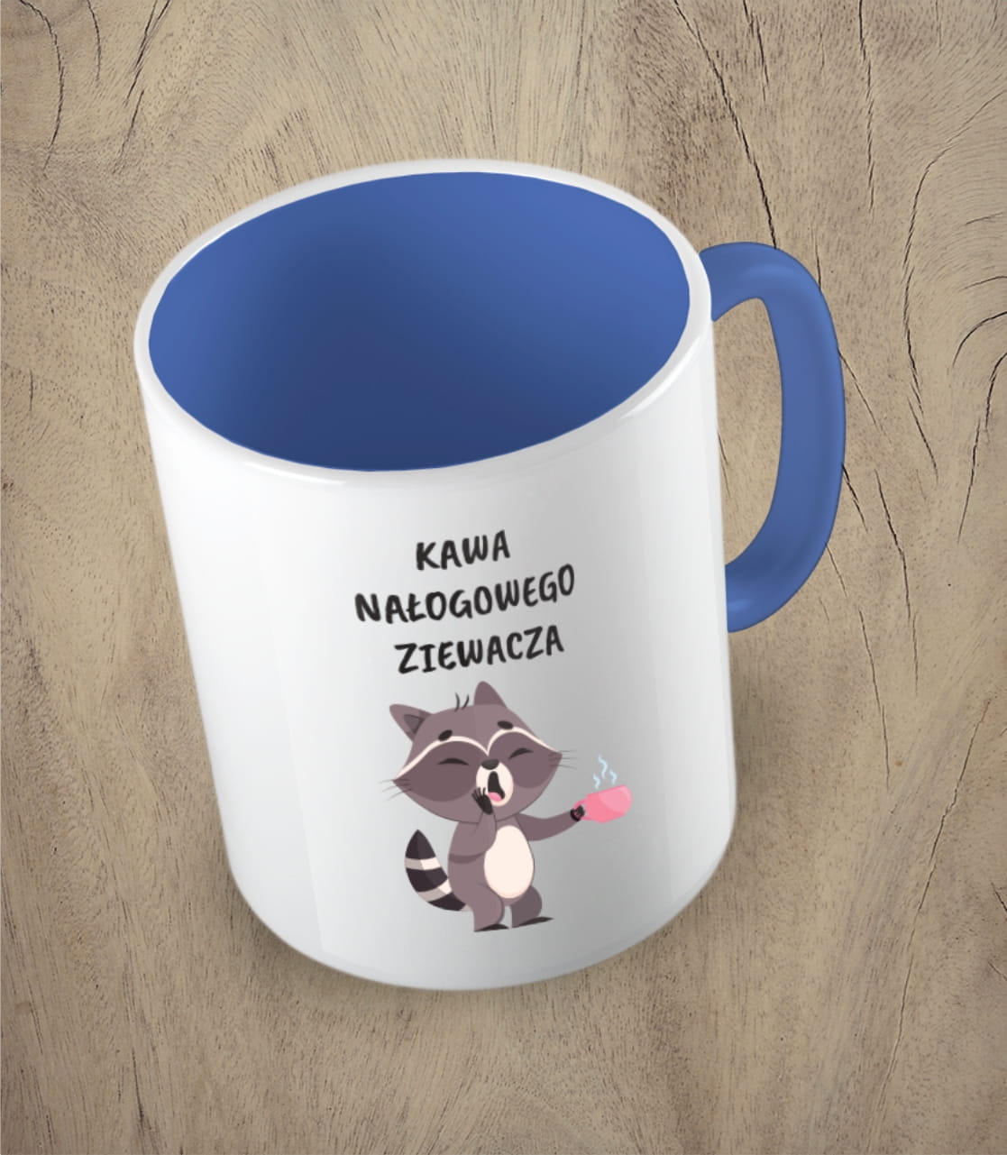 Zabawny kubek na prezent z rysunkiem ziewającego szopa z kubkiem kawy.