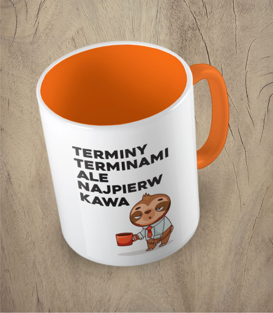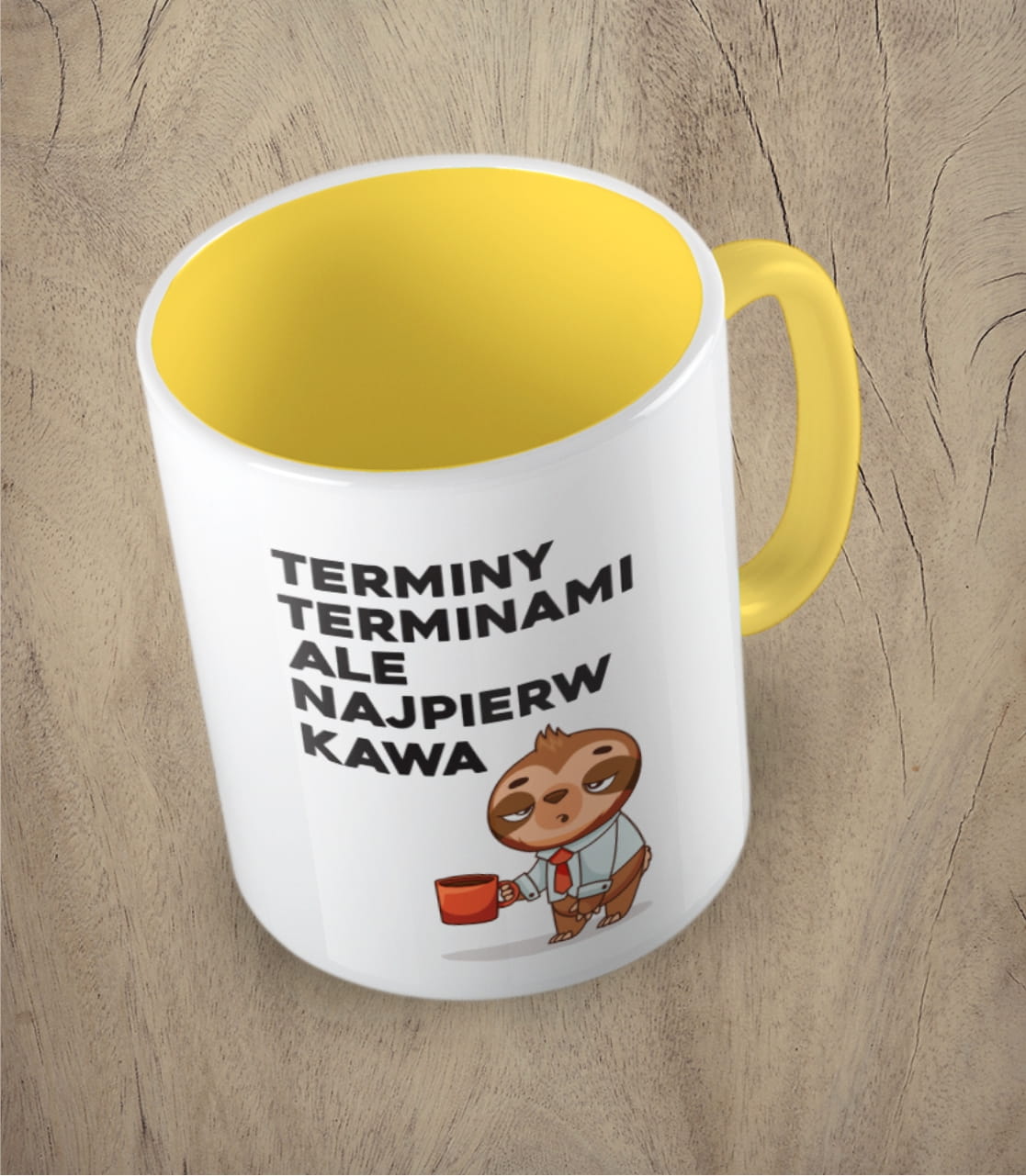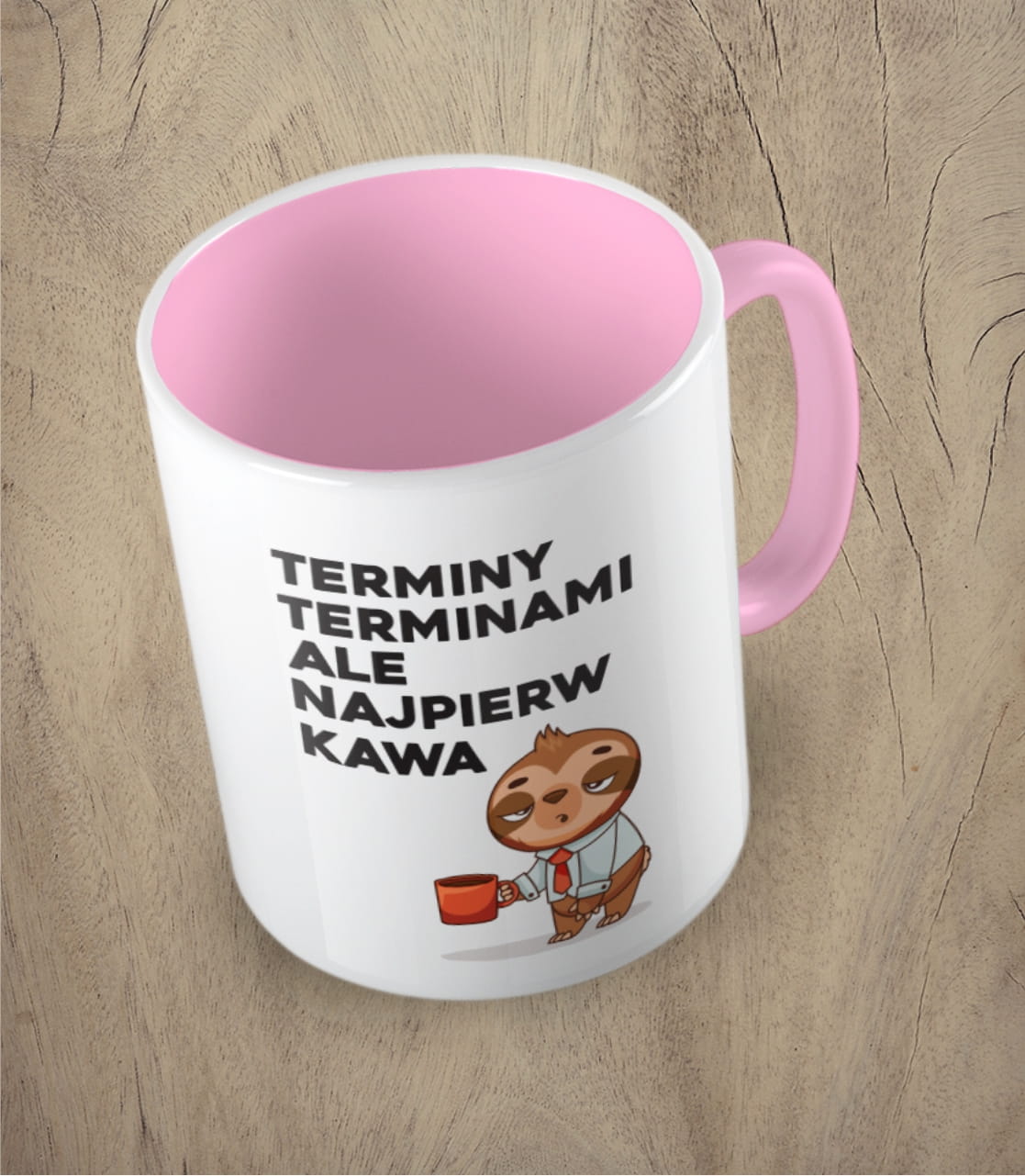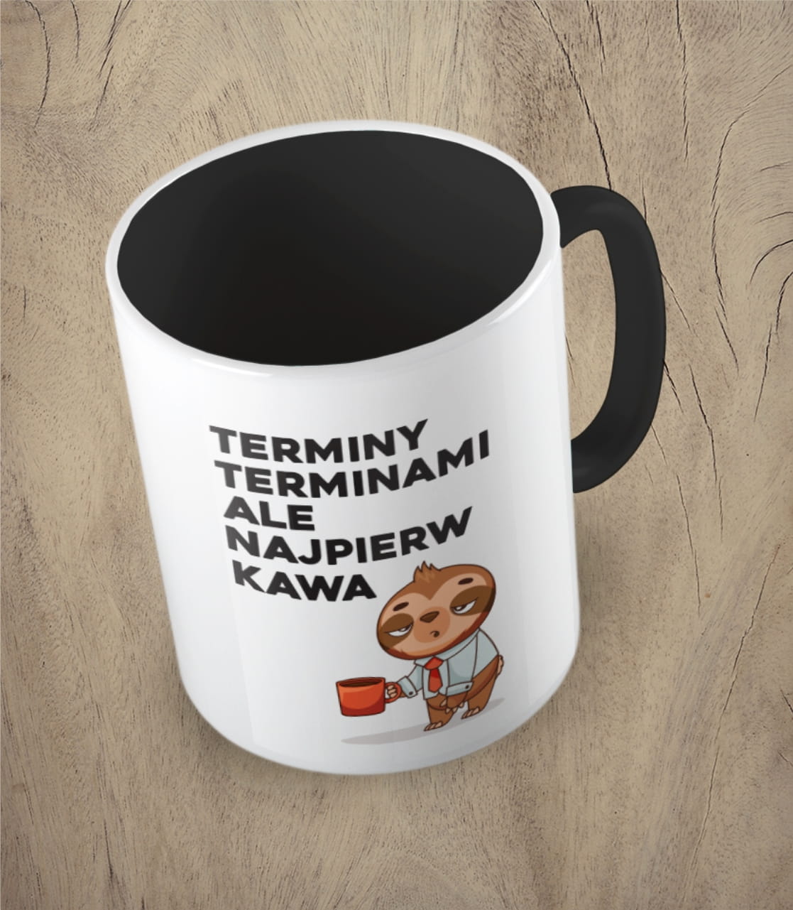 Śmieszny kubek z nadrukiem "terminy terminami ale najpierw kawa". Kubek na prezent dla kolegi i koleżanki z pracy.