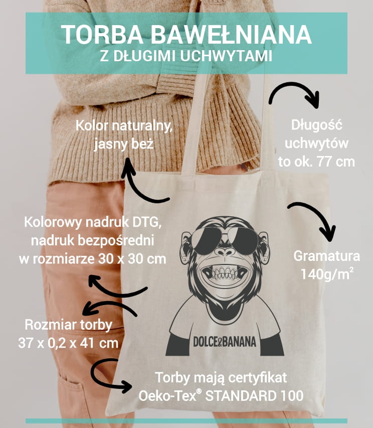 Wygodna, bawełniana torba na zakupy z długimi rączkami. Grafika znajduje się po jednej stronie. Torba ma wymiary 38x0,3x42 cm. Długość uchwytów to ok. 77 cm. Gramatura materiału - 140 g/ m kw. Torba posiada certyfikat Oeko-Tex® STANDARD 100.