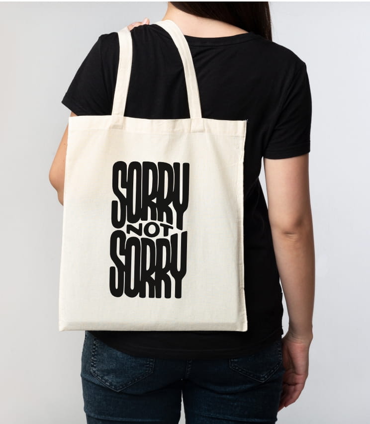 Torba na zakupy wykonana z bawełny z czarnym nadrukiem hasła "sorry not sorry". Fajny prezent dla osób, które nie boją się wyrazić własnego zdania.