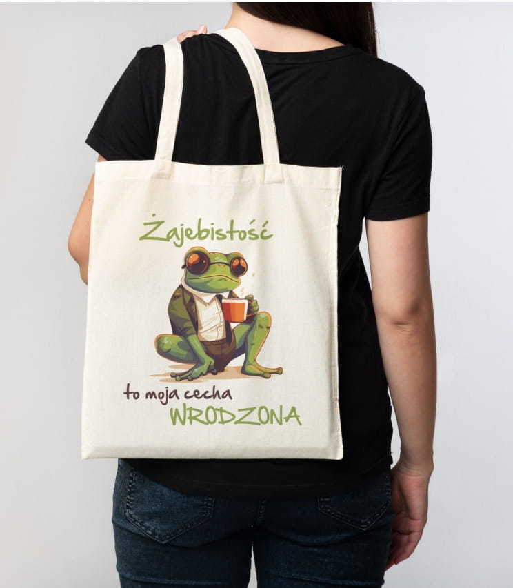 Torebka bawełniana z panem żabą i zabawnym napisem "żajebistość to moja cecha wrodzona". Wzór może być prezentem dla chłopaka, partnera, męża czy kolegi.