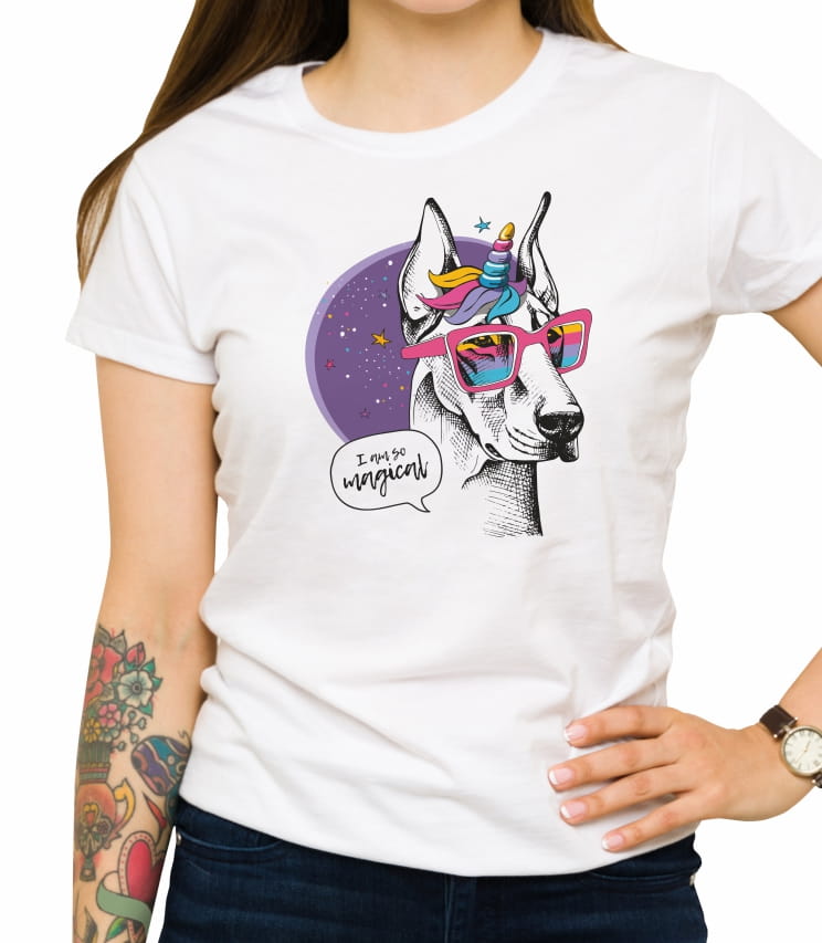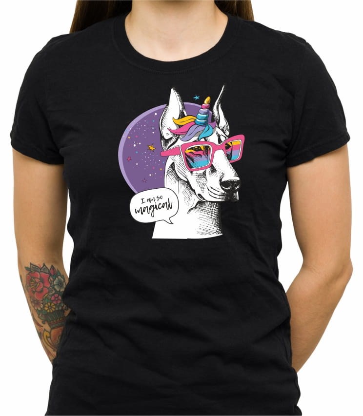 Koszulka z nietypową, fantastyczną postacią - psem jednorożcem.