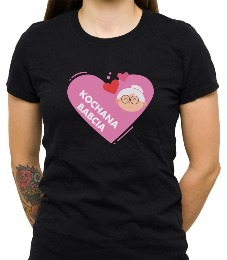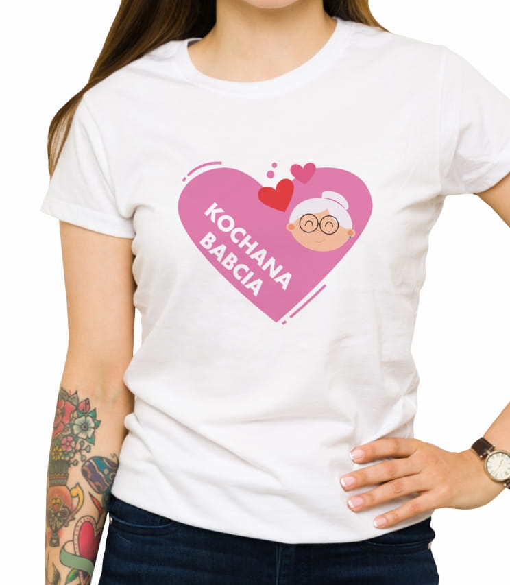 T-shirt na prezent dla babci posiadający nadruk serca i napis "kochana babcia".