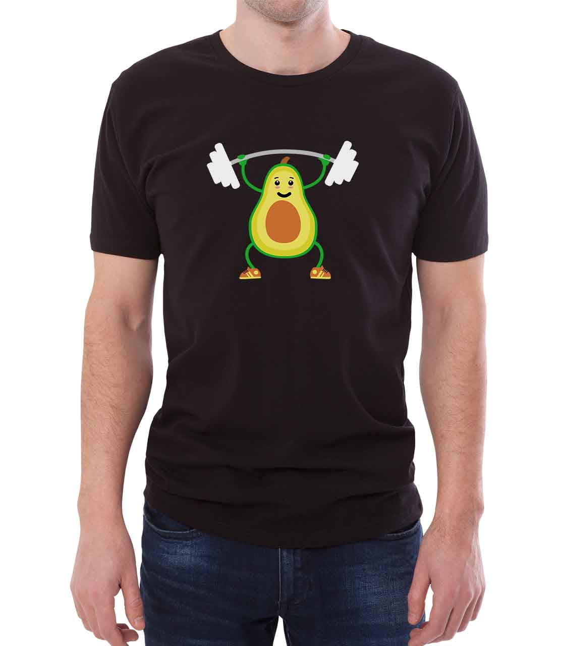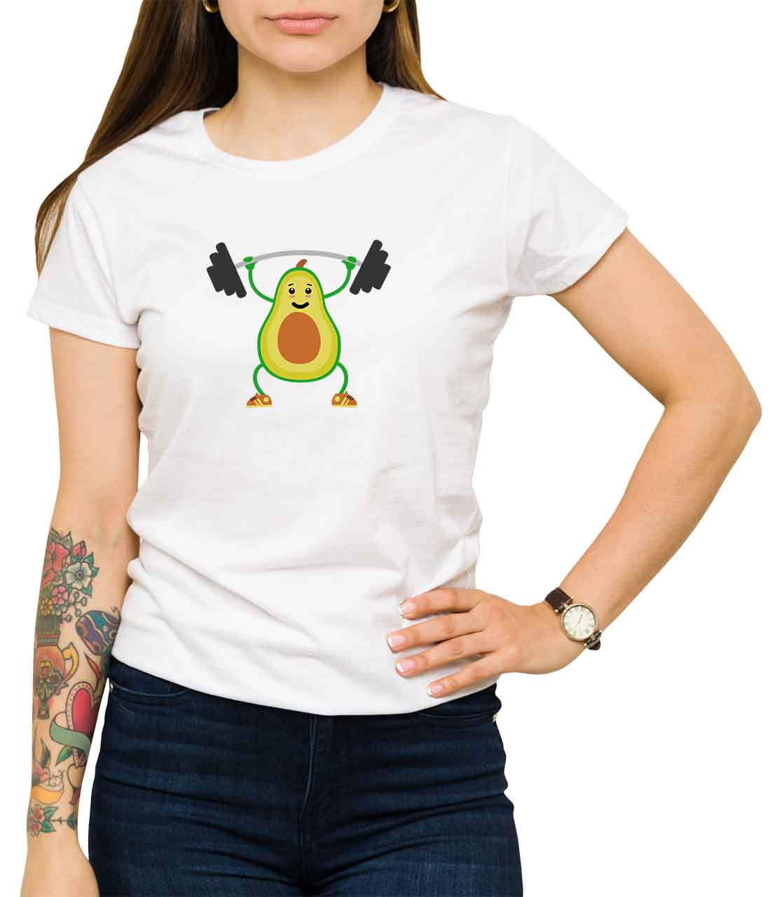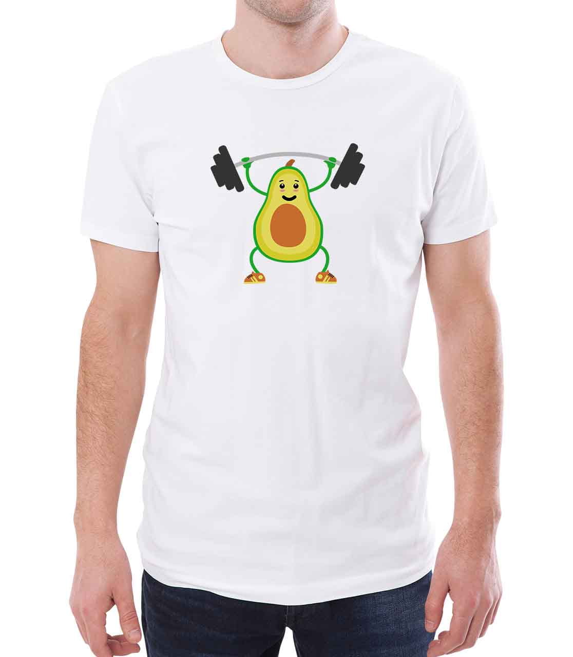 T-shirt dla wegan i wegetarian z nadrukiem awokado podnoszącego ciężary.