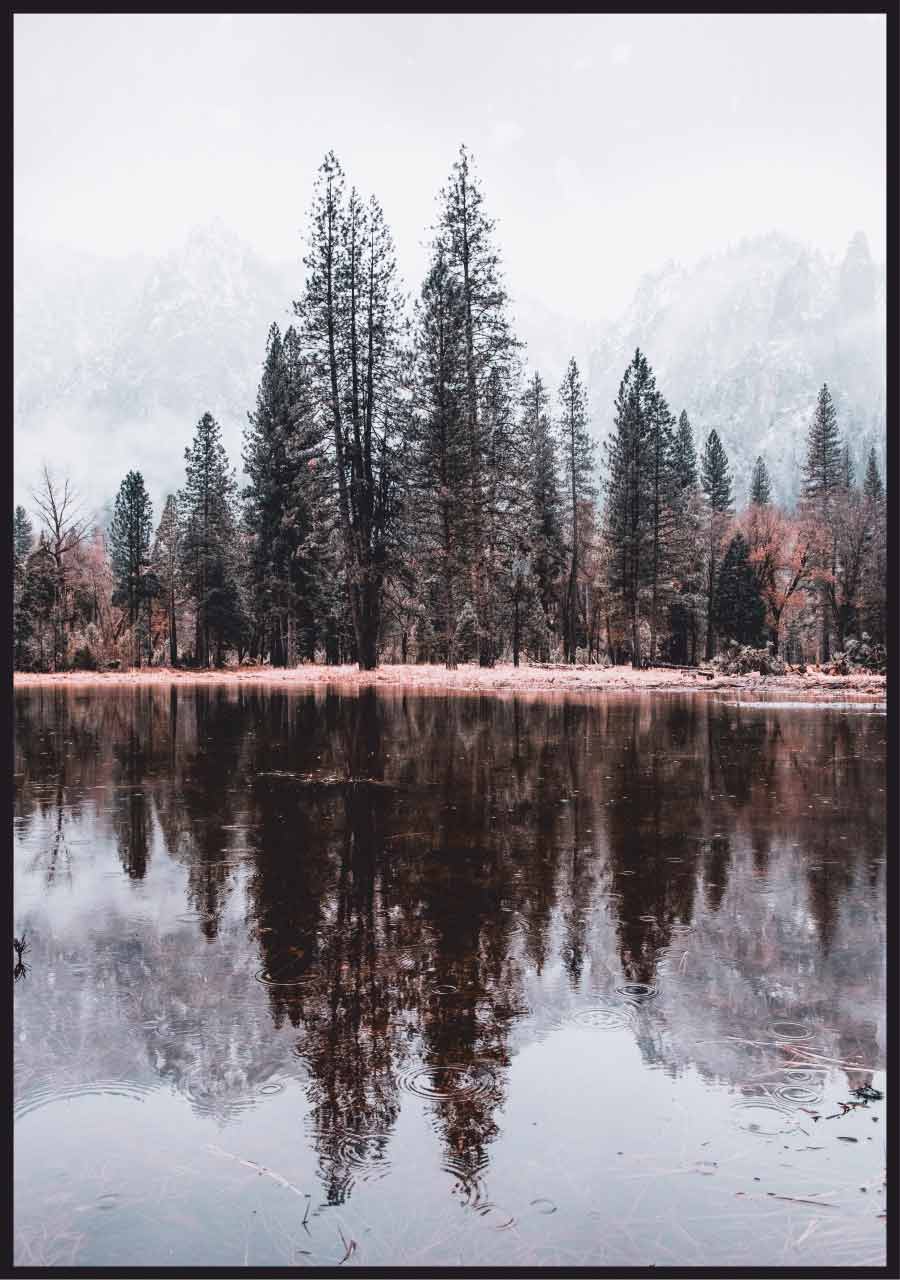 Zdjęcie lasu na brzegu spokojnej rzeki to wyciszająca kompozycja, prezentująca uroki zimowego krajobrazu. Ośnieżone szczyty gór oraz gładkie lustro wody sprawiają, że można zatracić się w fotografii. Z plakatu bije wrażenie chłodu, kontrastujące z kolorem wiecznie zielonych drzew. Fotografia może być samodzielną ozdobą lub też tworzyć zestaw z plakatami o podobnej tematyce.
