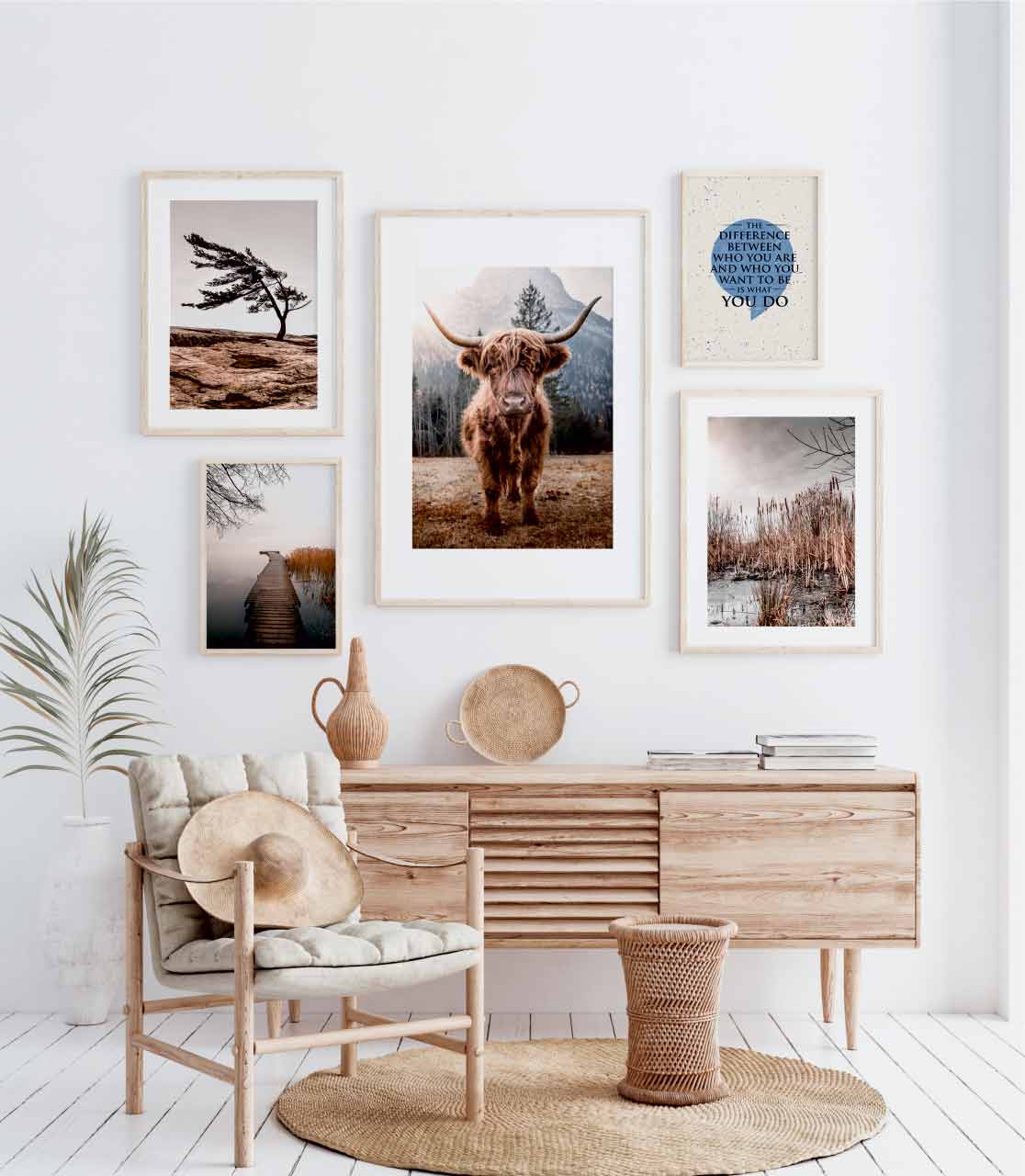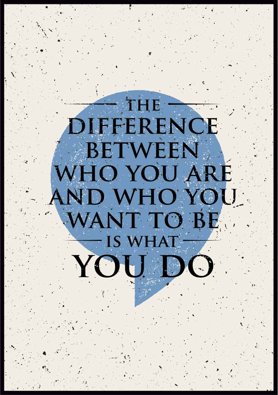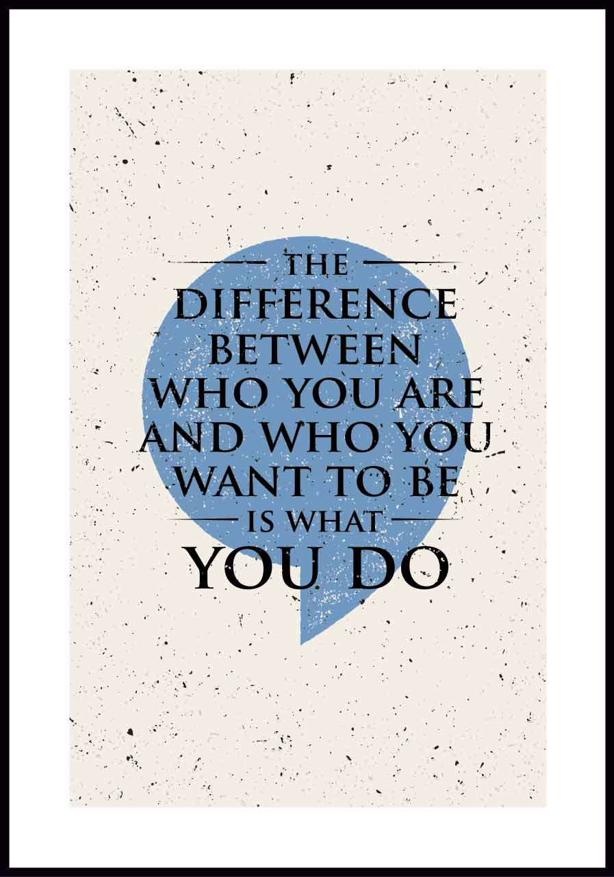 Minimalistyczny plakat z inspirującym tekstem „Różnicą pomiędzy tym, kim jesteś, a kim chciałbyś być jest to, co robisz” ("The difference between who you are and who you want to be is what you do"). Na jasnym, grunge’owym tle umieszczony jest apostrof mający symbolizować fragment znaku cudzysłowu, a cały tekst, w kolorze czarnym, zapisany jest przyjemną dla oka i elegancką szeryfową czcionką.