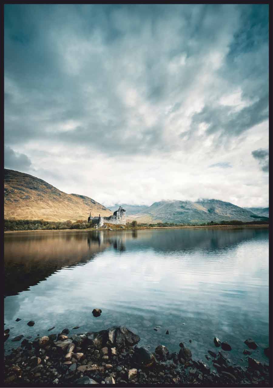 Cudowny plakat krajobrazowy, który oddaje niesamowity klimat szkockiego wybrzeża. U podnóża gór znajduje się historyczny zamek. Fantastyczne połączenie wody, lądu oraz nieba na jednym plakacie.