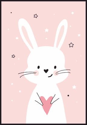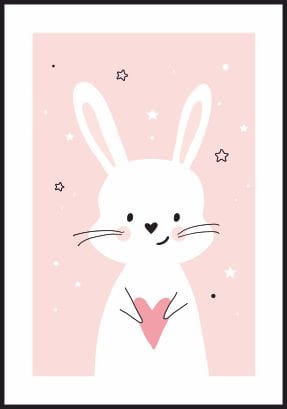 Uroczy obrazek słodkiego króliczka z serduszkiem trzymanym w łapkach. Plakat z przewagą delikatnego różu skradnie serce zwłaszcza małym dziewczynkom.