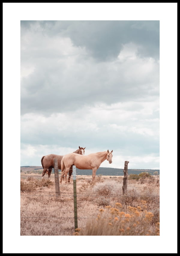 Plakat ze zdjęciem koni na tle surowego krajobrazu.