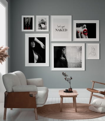 Grafika z hasłem może być pojedynczą ozdobą oraz tworzyć oryginalne kolaże na ścianę z ilustracjami w odcieniach szarości. Plakat Let's get naked to dobry pomysł na dekorację sypialni, salonu, korytarza czy gabinetu. Zachęca do odsłonięcia części siebie nie tylko dosłownie, ale również otwarcia się na innych w sensie metaforycznym. Będzie przysłowiową wisienką na torcie w aranżacji mniejszego i większego każdego wnętrza.