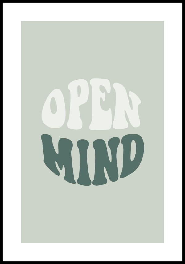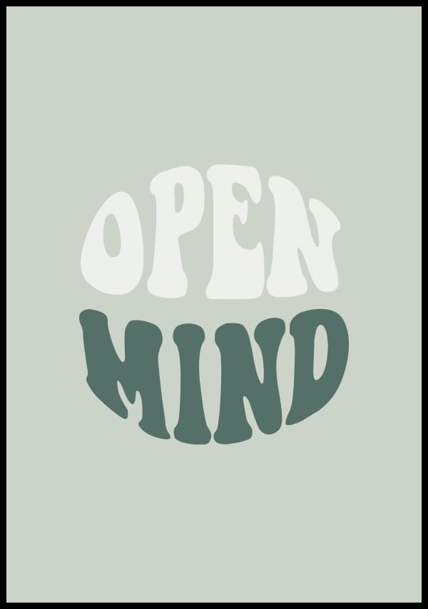 Graficzny plakat z napisem "open mind" - "otwarty umysł". Ciekawa dekoracja do pracowni kreatywnych, klas czy biur.