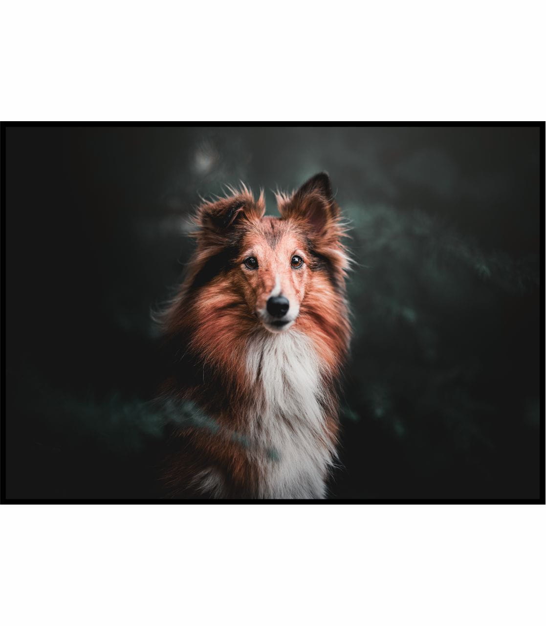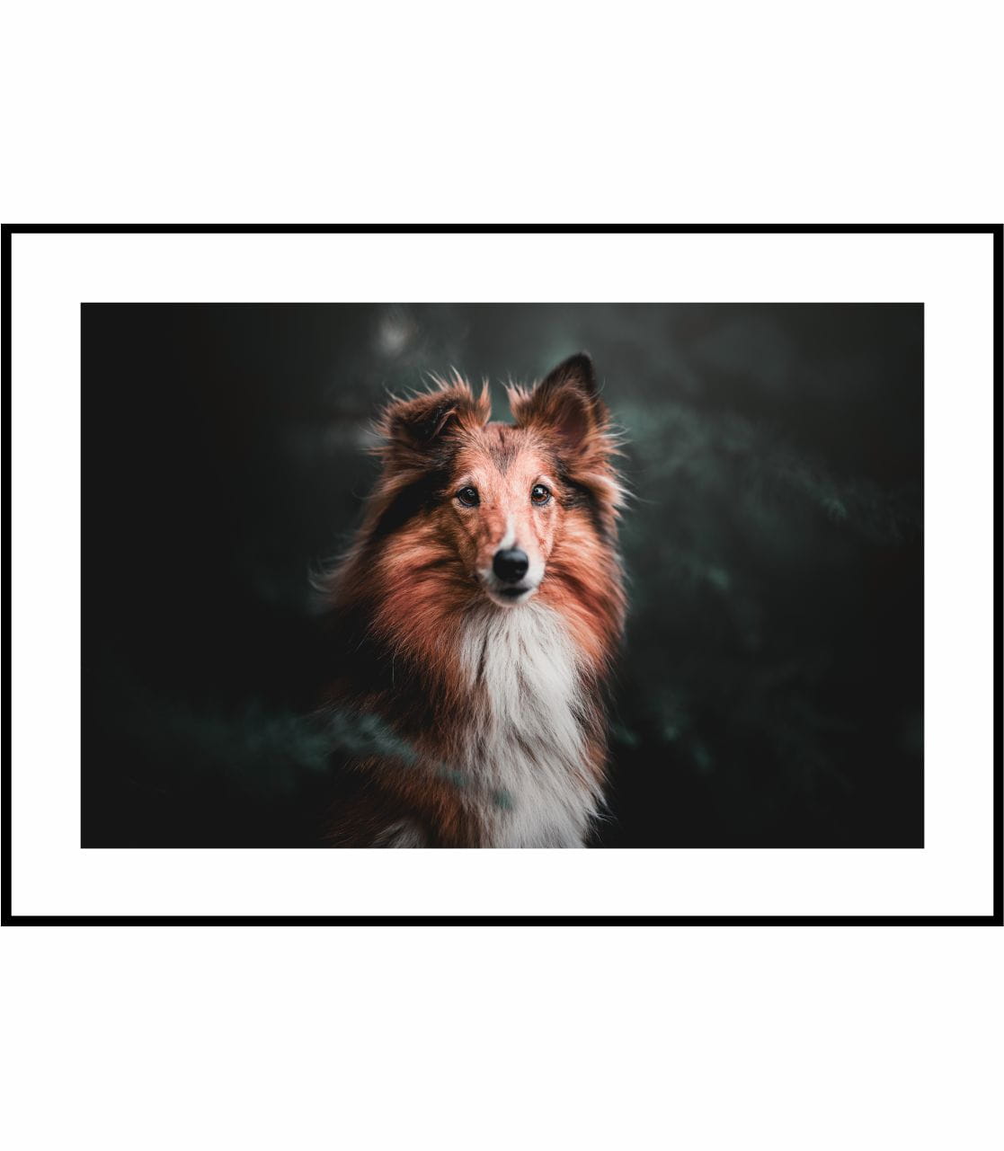 Plakat z przepięknym psem rasy owczarek szetlandzki na ciemnym tle.