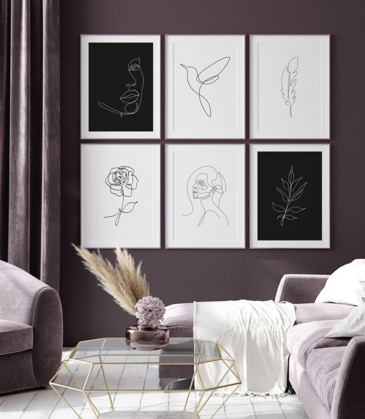 Czarno-biały minimalistyczny plakat line art przedstawiający twarz kobiety malowaną za pomocą linii. Prosta, a jednocześnie ciekawa grafika wykorzystuje kreskę do zaprezentowania wyrazistego przekazu. Kobiece lico jest częściowo skryte w cieniu. Pozostała część ma pięknie zarysowane kości policzkowe, pełne usta, wydatną brodę i delikatny łuk brwiowy. Widza tego portretu przyciąga nieco melancholijny, zamyślony wzrok, na którym można dłużej skupić uwagę. Wyraża on bardzo wiele, smutek, tęsknotę, a może niespełnioną miłość? Zaskakujące jest to, że z na pozór bardzo prostego rysunku można wyczytać tak wiele.