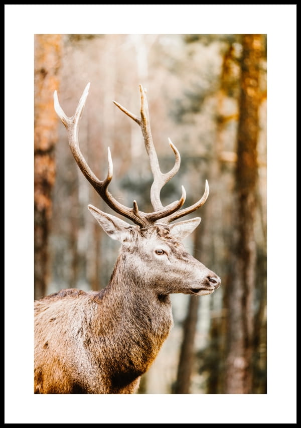Zdjęcie dostojnego jelenia na tle jesiennego krajobrazu lasu. Ciepły plakat ze zwierzęciem sprawi, że każde wnętrze stanie się przytulne. Fotografię można komponować z innymi plakatami w podobnej kolorystyce lub tematyce, które będą przedstawiać rośliny lub zwierzęta.