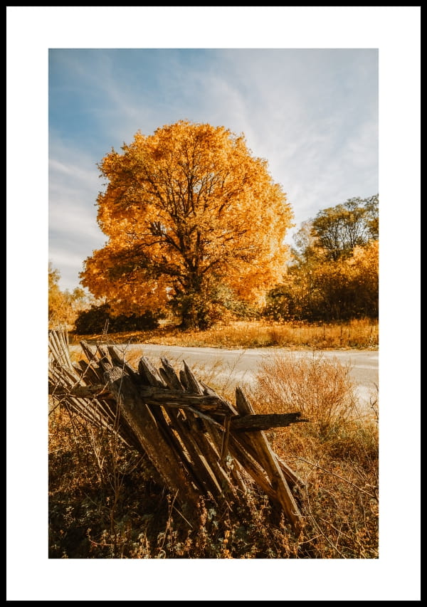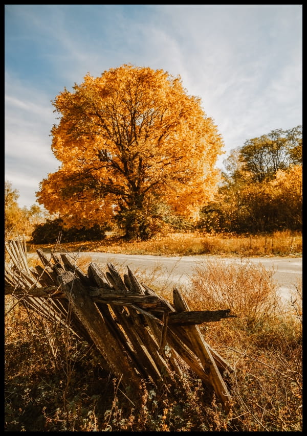 Jesienne zdjęcie wiejskiego krajobrazu ze starym, drewnianym płotem i dużym drzewem ze złocistymi liśćmi.