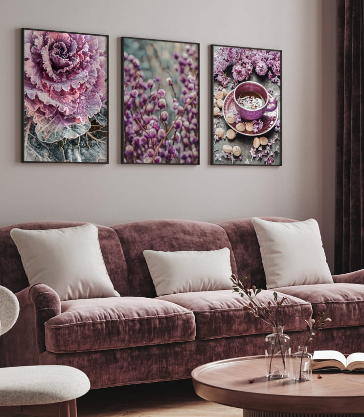 Zestaw plakatów z przewagą koloru fioletowego do kobiecego salonu.