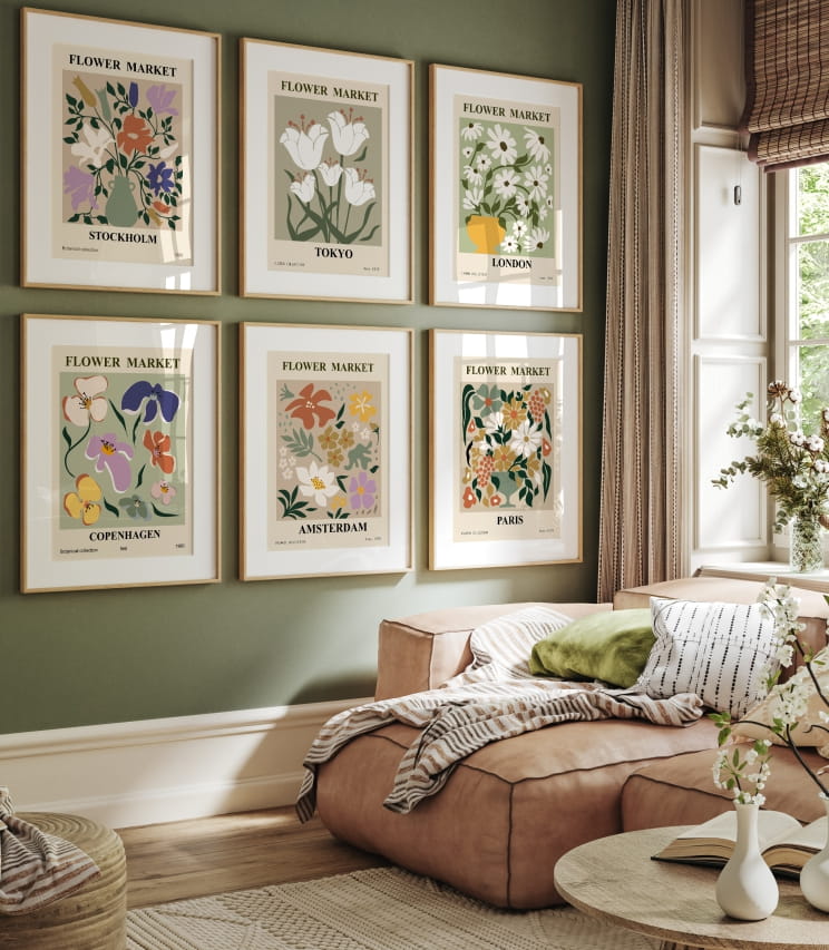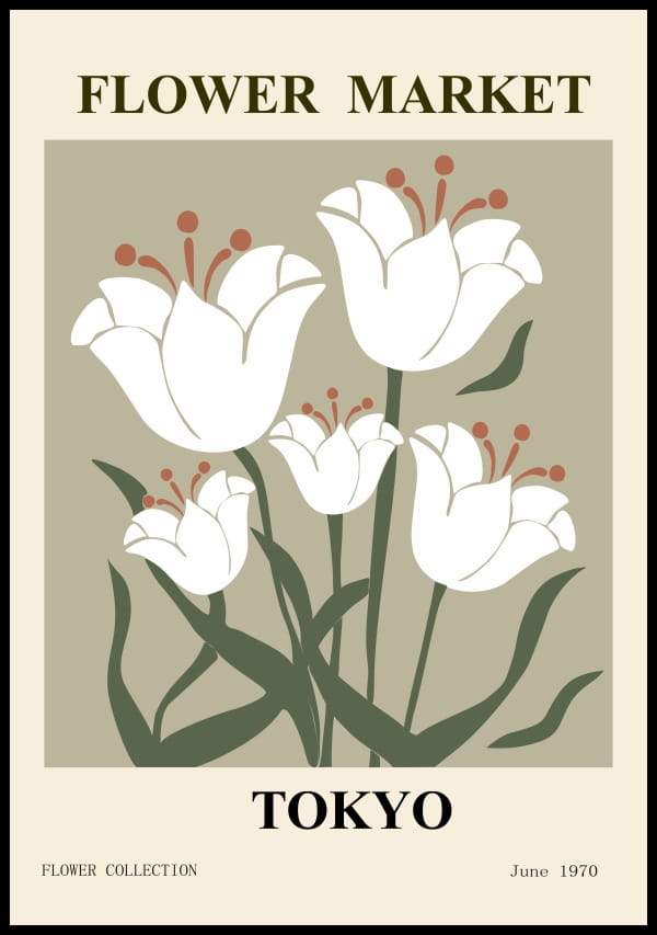 Zestaw subtelnych, graficznych plakatów z kwiatami z odcieniem beżu.
