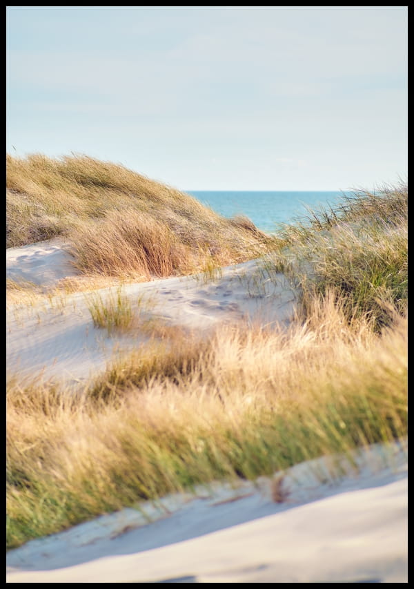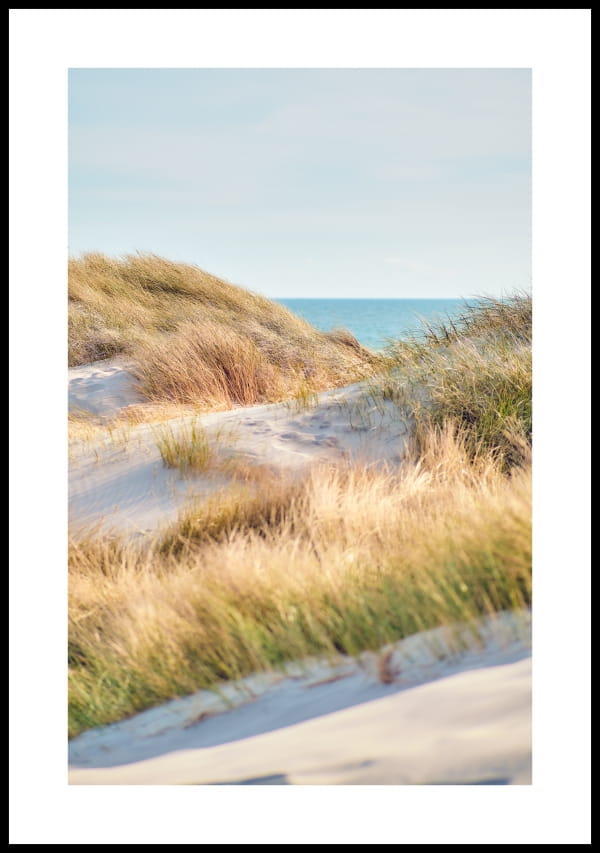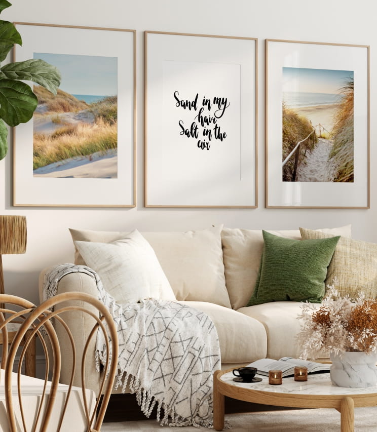 Zestaw 3 letnich plakatów nawiązujących do wypoczynku nad morzem. 2 plakaty są fotografią nadmorskiego brzegu, natomiast 1 czarno-biały plakat zawiera napis.