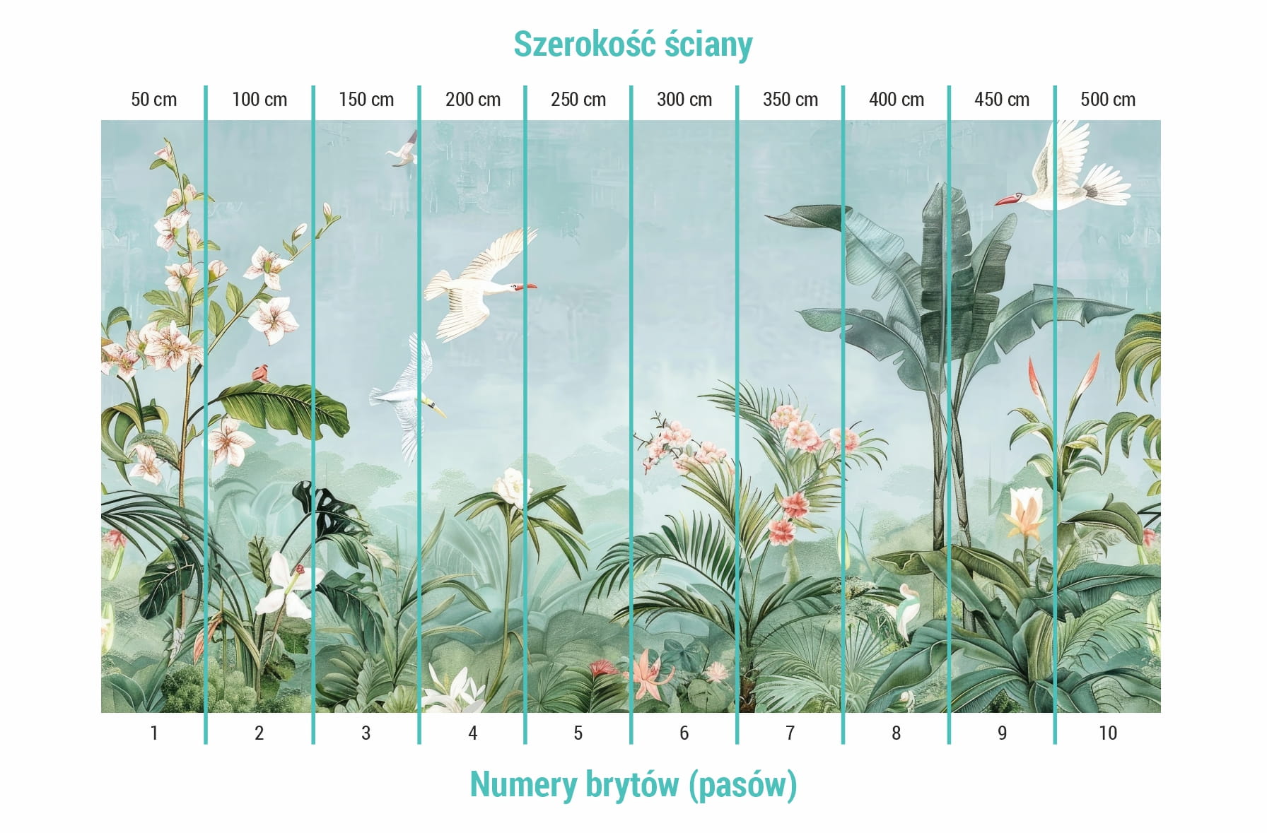 Zmierz szerokość swojej ściany, podziel ją przez 50 i zaokrąglij wynik w górę. Otrzymana liczba wskazuje ile sztuk (brytów) tapety należy dodać do koszyka.