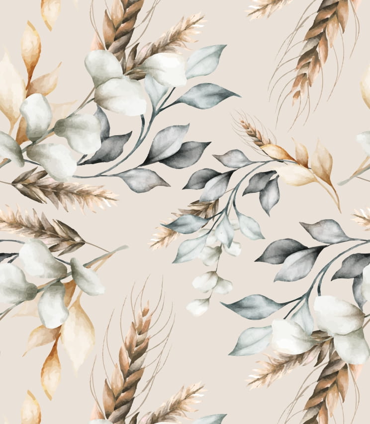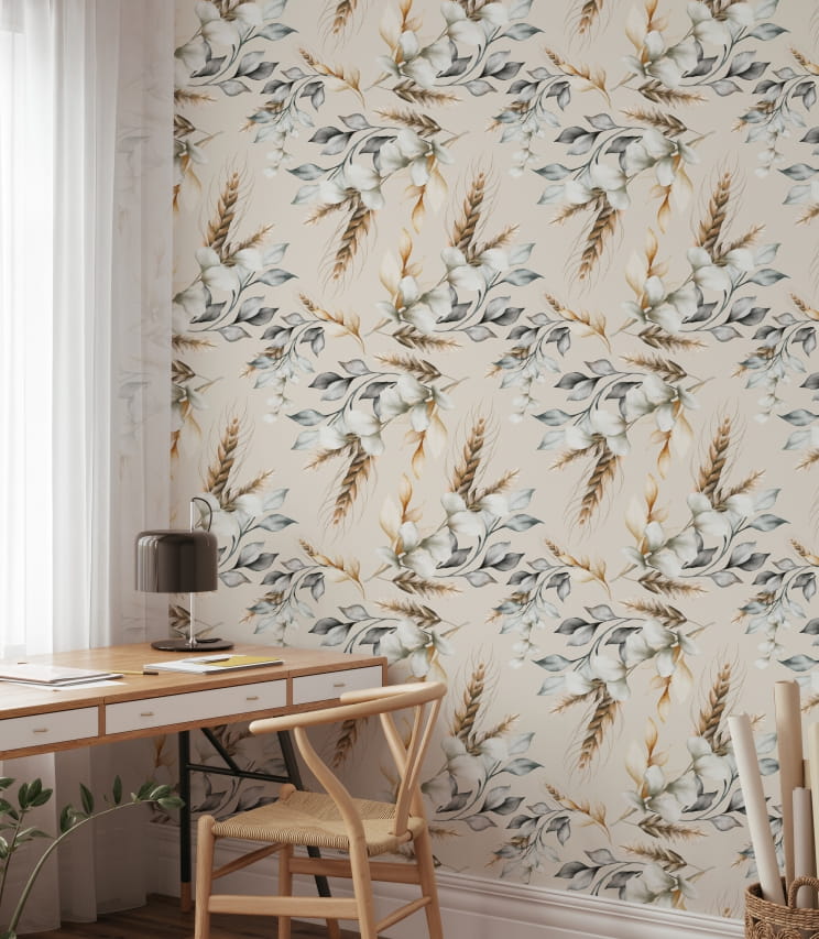 Tapeta "Kwiaty vintage na beżowym tle" to delikatny, naturalny wzór, w którym beż łączy się z szarością.