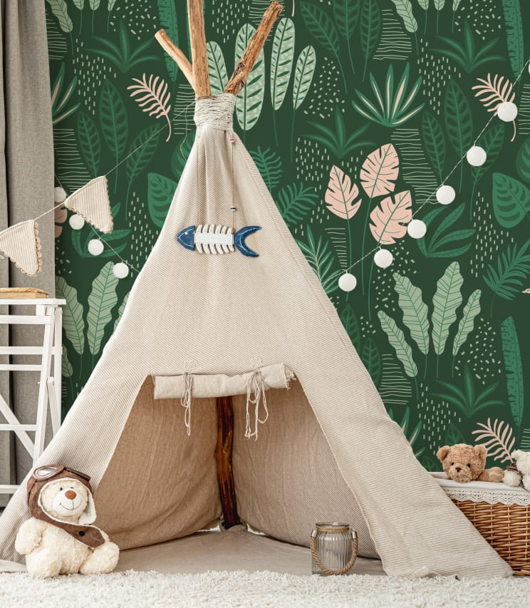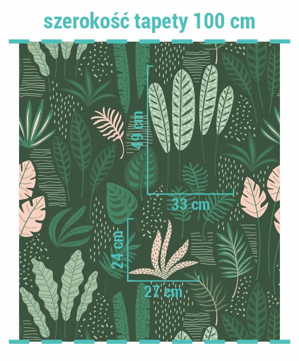 Tapeta "Zielone wspomnienia" to bardzo ładny, dziecięcy wzór z liśćmi i roślinami przypominającymi dżunglę.