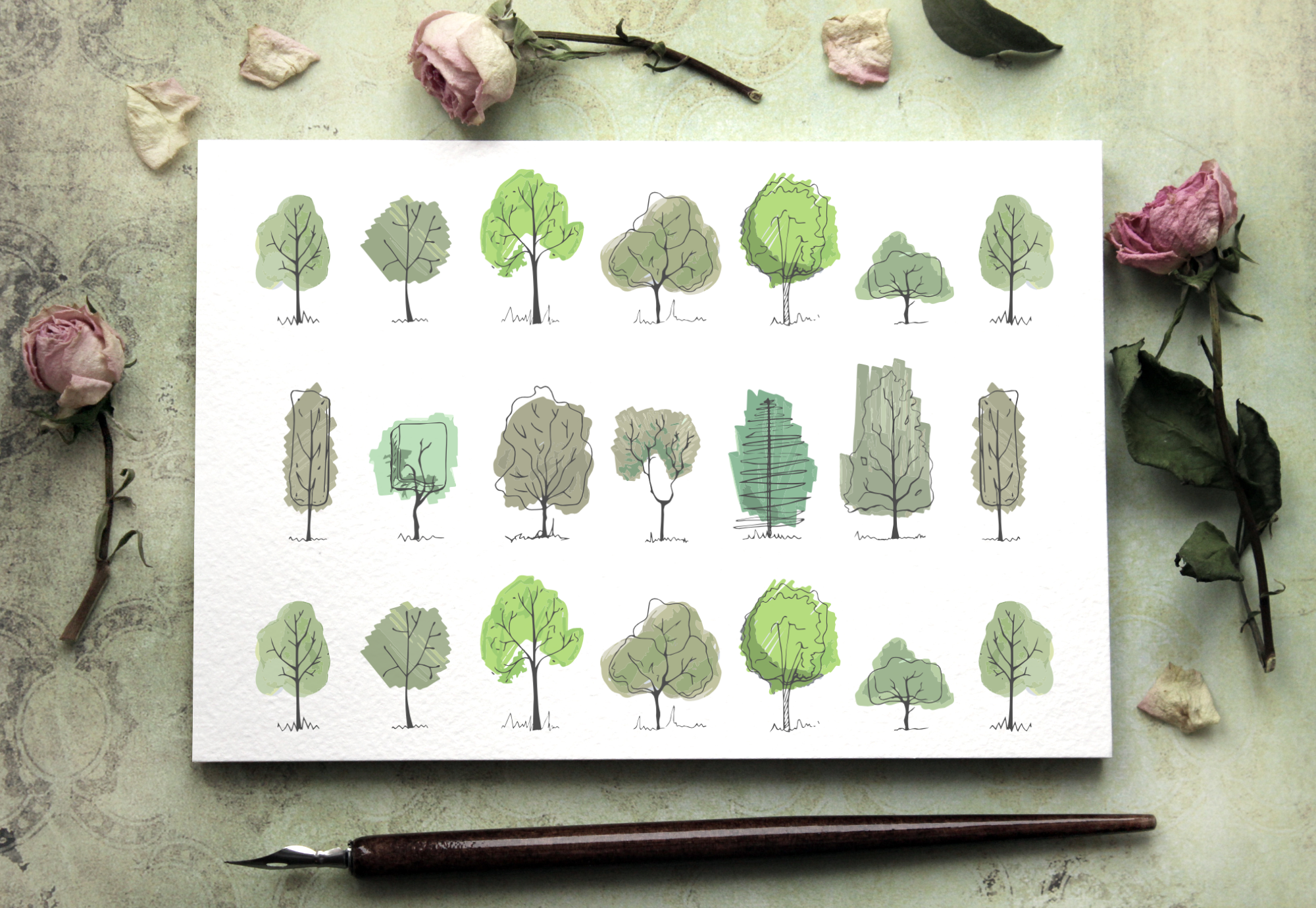 Tatuaże zmywalne z zielonymi i brązowymi drzewami. Zestaw naklejek na ciało z ekologicznymi wzorami.