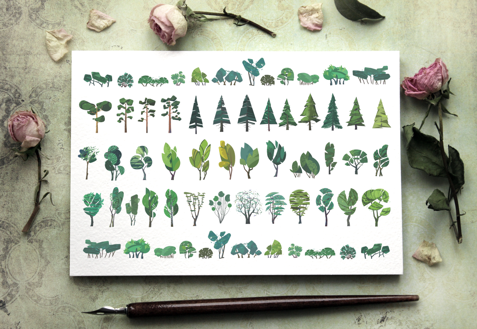 Set zmywalnych tatuaży z różnymi drzewami i krzaczkami. Zestaw naklejek na ciało idealny na imprezy proekologiczne i na świeżym powietrzu, a także promujące kontakt z naturą, np. Dzień Działkowca.