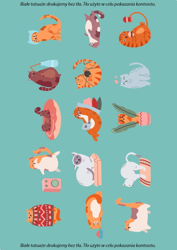 Tatuaże z kolorowymi kotkami, w których zakochają się miłośnicy mruczków. Zabawne koty przyłapane podczas różnych zajęć będą przykuwającą wzrok ozdobą ciała.