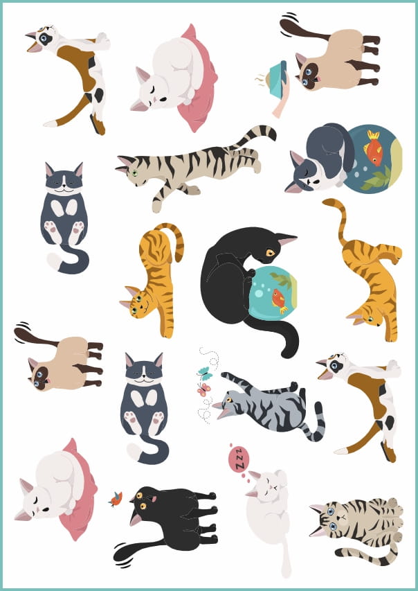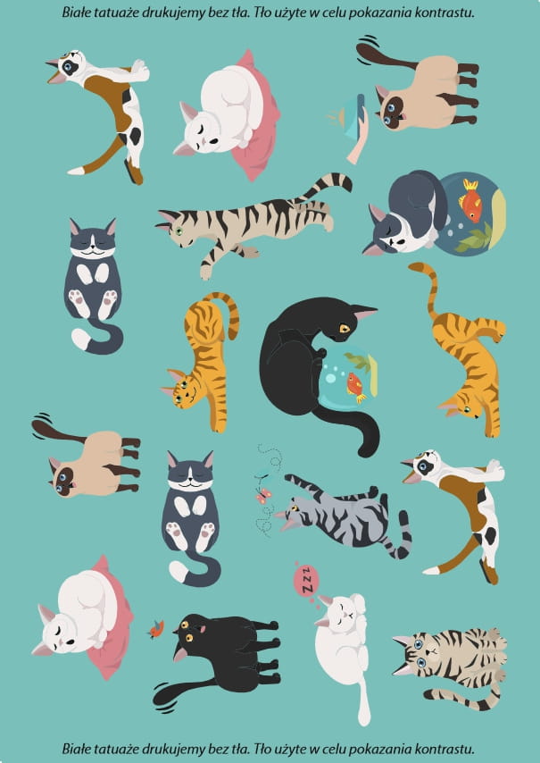 Naklejki wodne na skórę z grafiką kotów - tatuaże zmywalne kolorowe koty, dla miłośników kotów różnych ras.