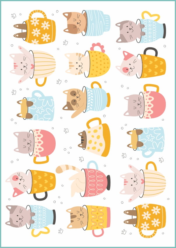 Zestaw tatuaży - naklejek na ciało ze wzorami kotów schowanych w kolorowych kubeczkach.