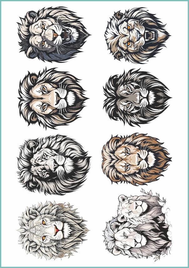 Zestaw tatuaży zmywalnych przedstawiający głowy lwów z piękną grafiką.