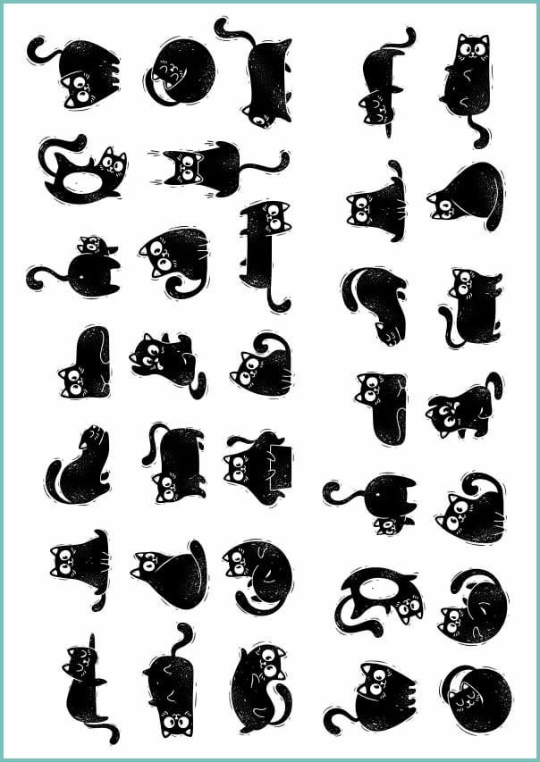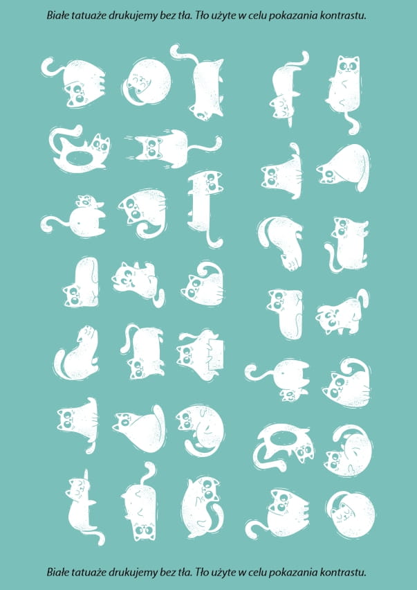 Tatuaże w białym lub czarnym kolorze ze wzorami zabawnych kotków. Skomponuj swój zestaw tatuaży lub noś po jednym tatuażu na raz.