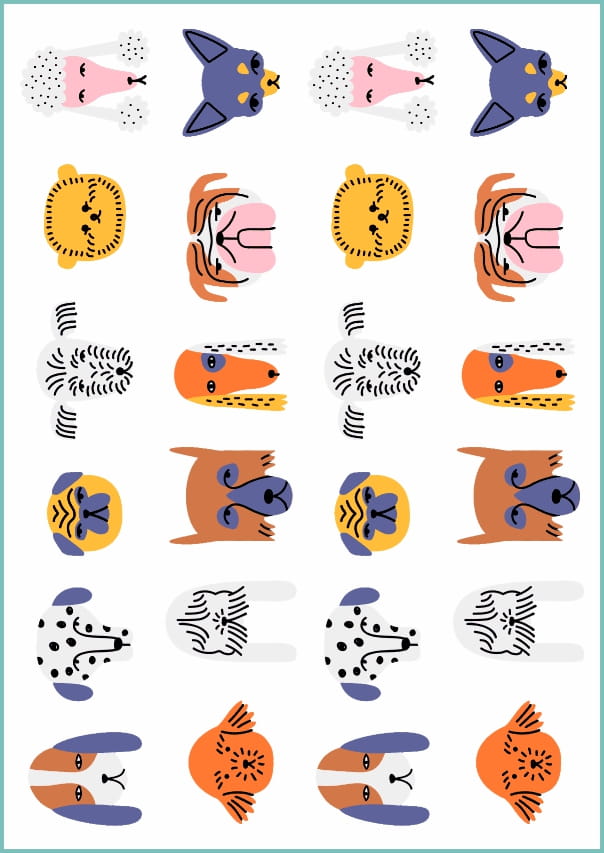 Zestaw tatuaży zmywalnych z kolorowymi głowami piesków będzie wspaniałą ozdobą ciała dla małego miłośnika czworonogów.